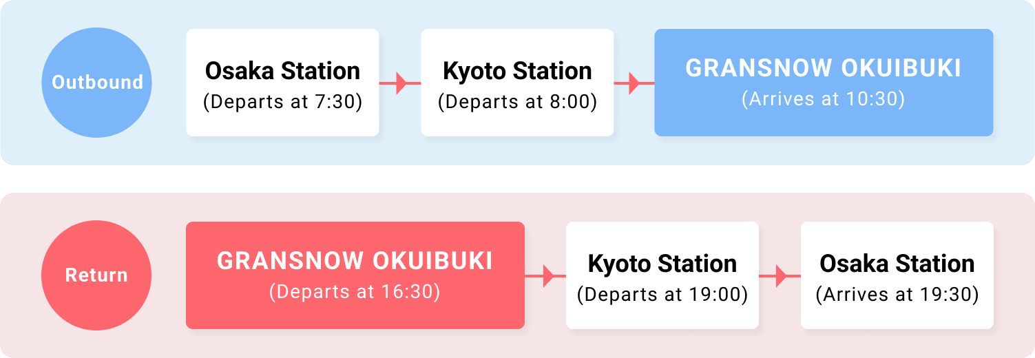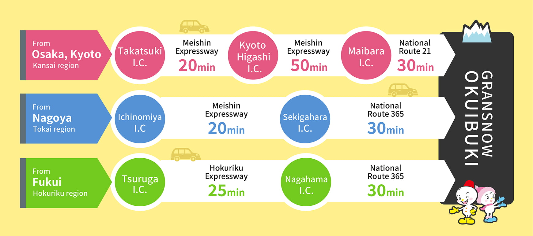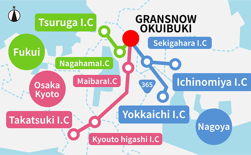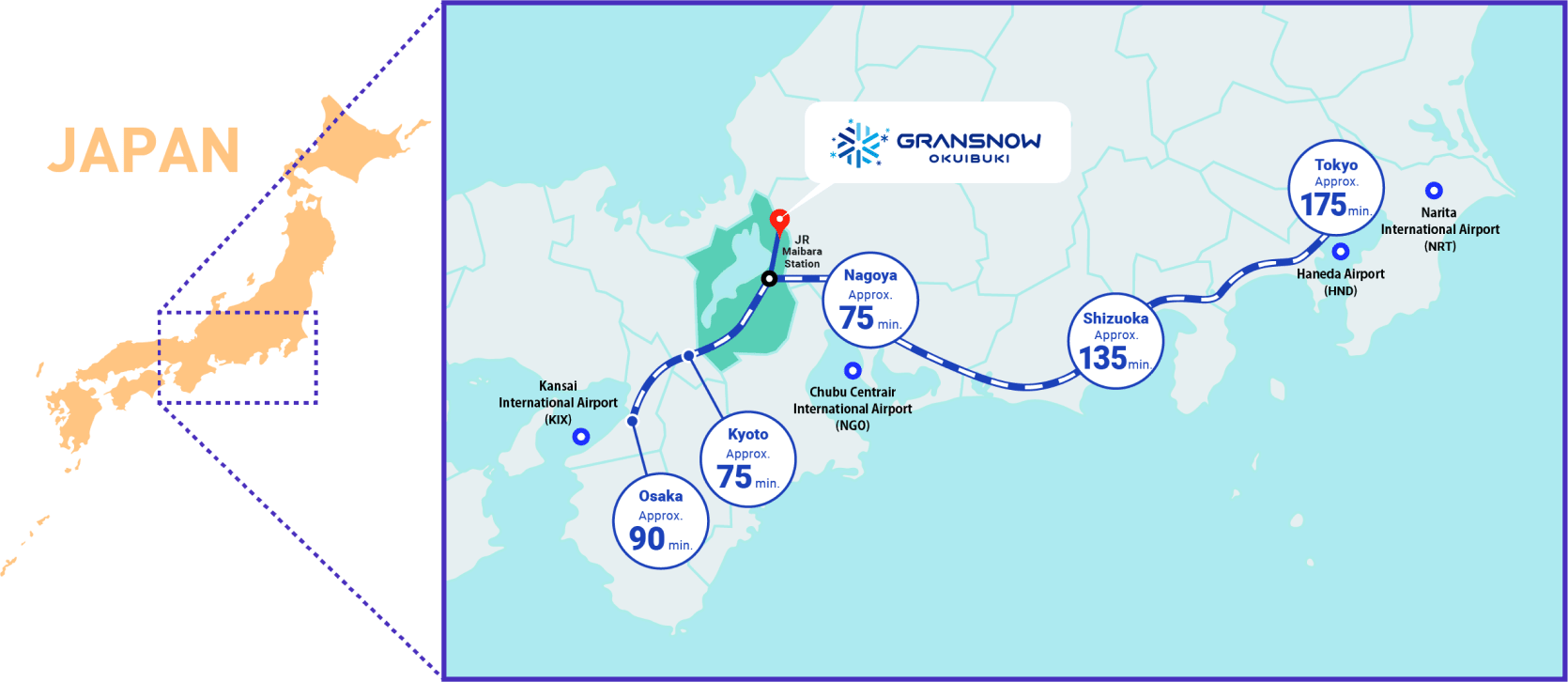 100 minutes from Osaka! 80 minutes from Kyoto! 50 minutes from Nagoya! Head to GRANSNOW OKUIBUKI (formerly Okuibuki Ski Resort) for a day trip without traffic jams!