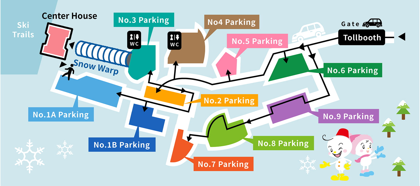 The parking lots at GRANSNOW OKUIBUKI (formerly OKUIBUKI SKI & SNOWBOARD) can accommodate up to 2,700 vehicles! No. 3 Parking Lot connects Arukande moving walkway that goes directly to the slopes, making access from the parking lots quick and easy! On busy days, our dedicated shuttle bus runs between parking lots! (Parking Lots No. 6 and No. 9)