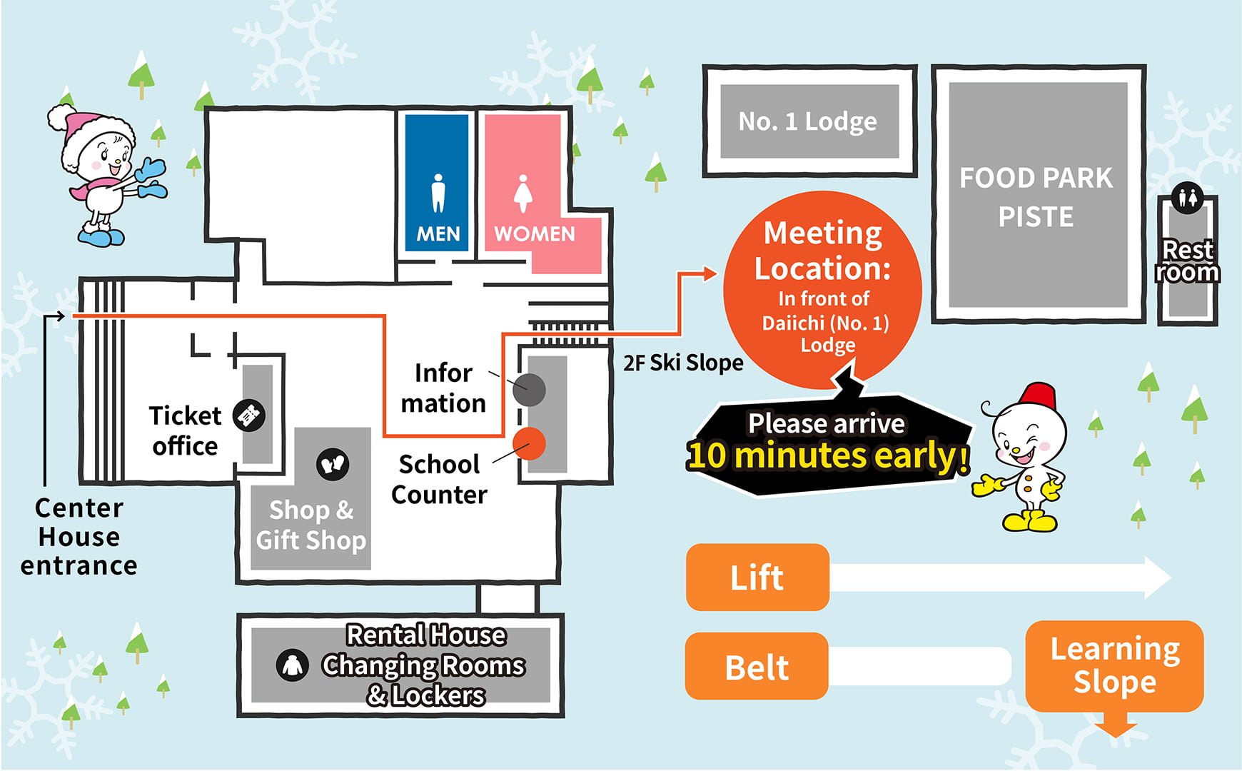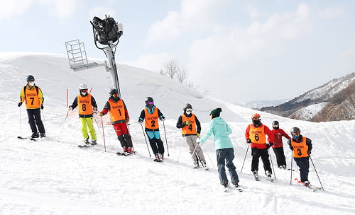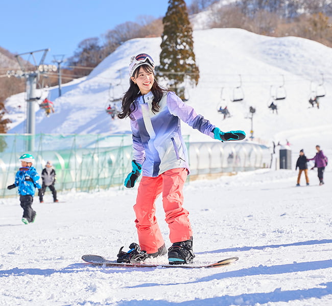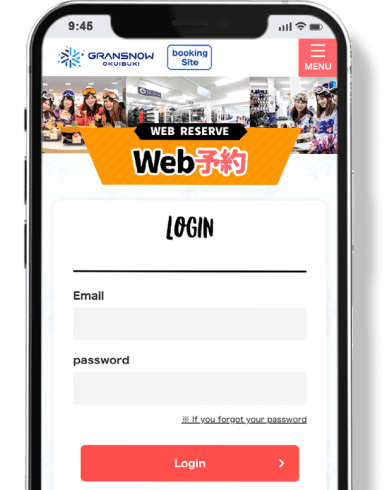 After arriving at the ski resort, proceed to the school reception counter. Listen to the explanation and sign up there!